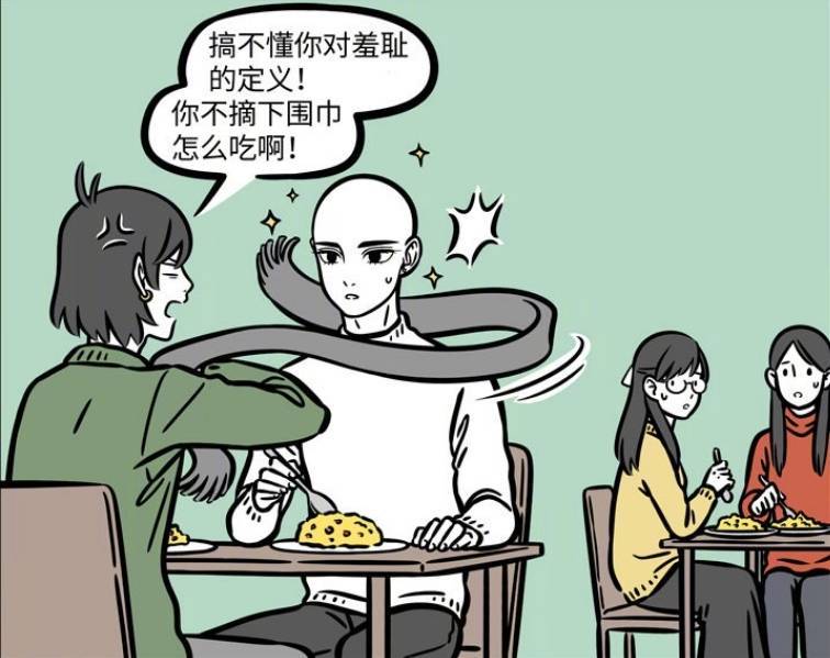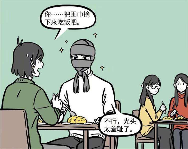 因为光头太过羞耻,金吒在和木吒一起吃饭的时候也是围着围巾,就算是吃饭都没有摘下来,一旁吃饭的小姐姐都被他们这一桌吸引。